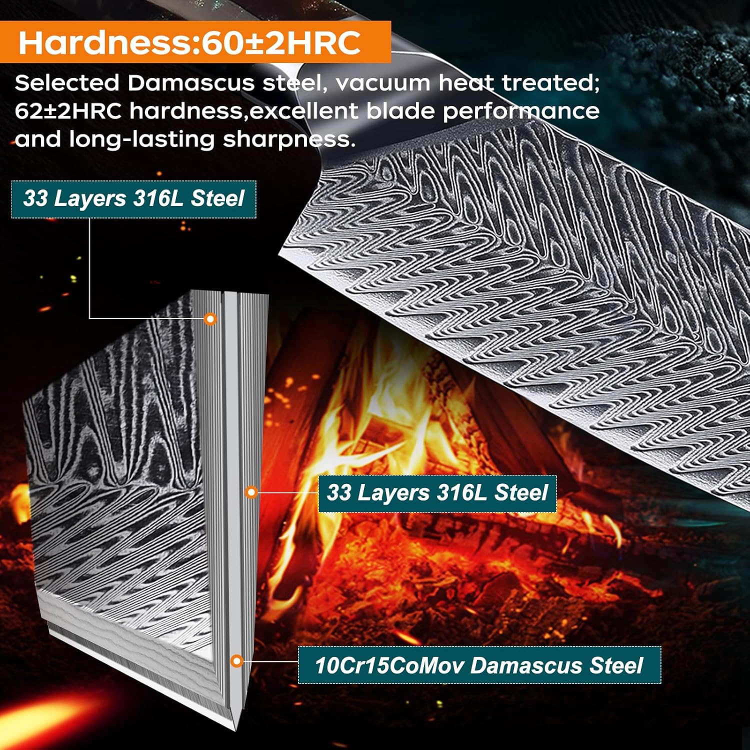 - Japanese Steel with (Damascus etching) high-carbon steel with a VG-10 cutting core, and HRC 62+ hardness.